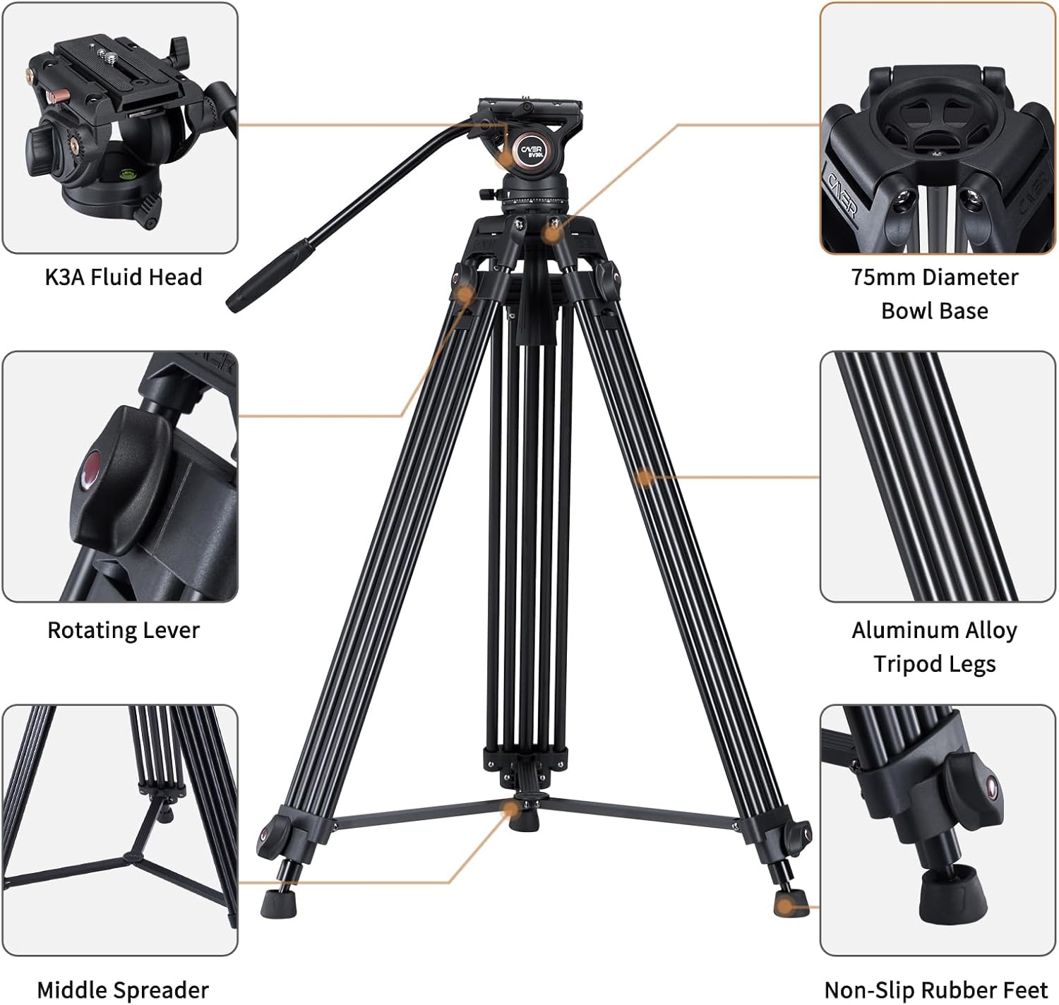 • 【Complete Video Tripod System】: Includes a two-stage aluminum tripod with mid-level spreader and K3 fluid head, supporting up to 13.2 lbs. Perfect for DSLR cameras, camcorders, and other video equipment.